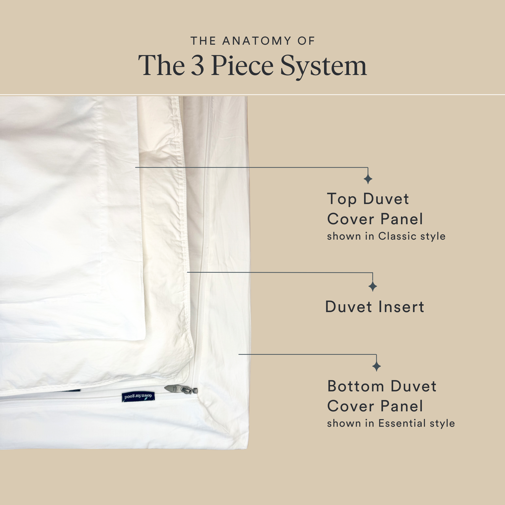 With our 3-Piece system cover panels attach directly to the duvet insert via our hidden zip system. You need all 3 pieces--duvet insert, and two cover panels for full system. Then replace or refresh only what you need.