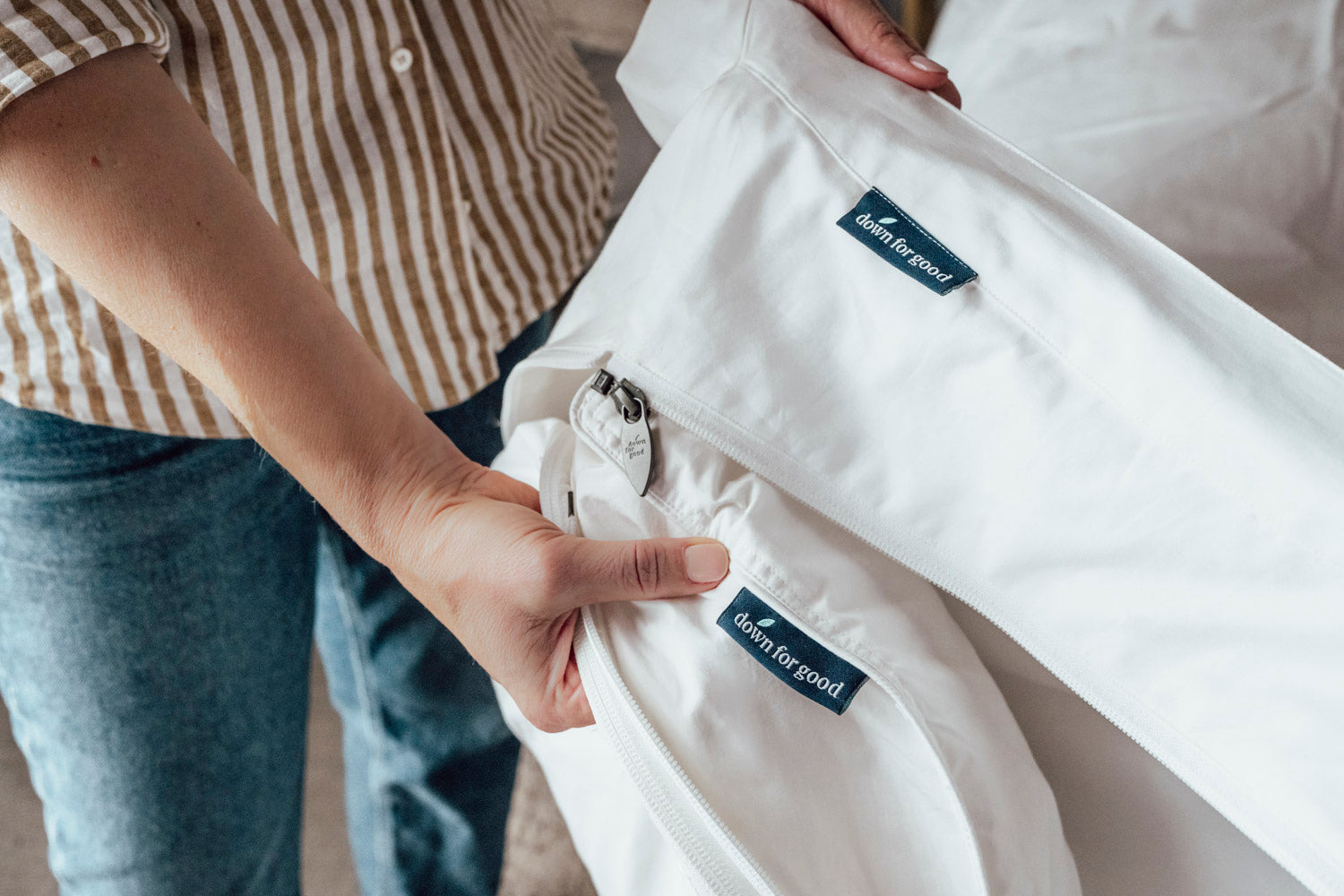 Positioned at the foot of your bed, our signature blue Down for Good tag marks the start of the hidden zipper for effortless assembly.